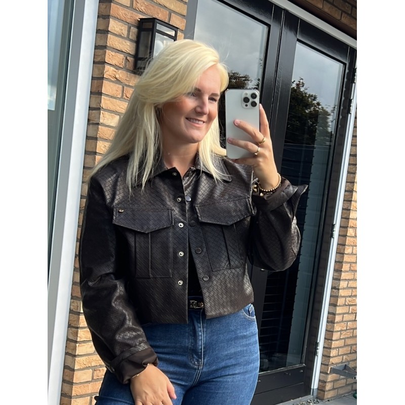 Dit mooie nep leren jasje heeft gevlochten details. Hij heeft een kraagje, knoopsluitingen en twee zakken op de borst.