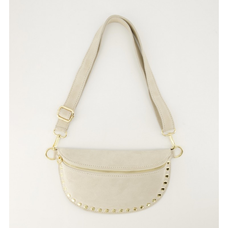Deze prachtige tas is gemaakt van suede leer. Het is een heuptas die ook crossbody gedragen kan worden. Hij heeft een binnenvak en steekvak. Het hengsel is verstelbaar. Hij heeft een ritssluiting en is afgewerkt met gouden details.