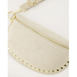 Deze prachtige tas is gemaakt van suede leer. Het is een heuptas die ook crossbody gedragen kan worden. Hij heeft een binnenvak en steekvak. Het hengsel is verstelbaar. Hij heeft een ritssluiting en is afgewerkt met gouden details. Afmeting: 23 x 14 cm